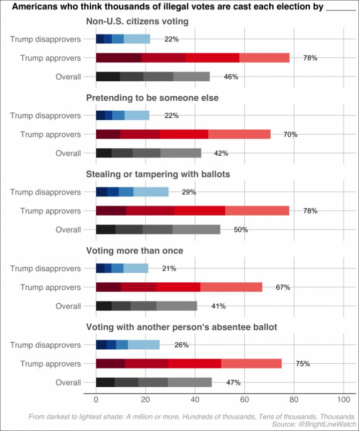 The result of their survey of the American public shows a clear partisan divide over the allegation of possible voter fraud: the percentage of Americans who believe that thousands of each type of illegal votes are cast in elections ranges from 41 to 50 percent overall. However, it never rises above 29 percent among those who disapprove of President Trump, whereas the percentages range from 67 percent (voting more than once) to 78 percent (non-US citizens voting or stealing or tampering with ballots) among Americans who approve of Trump.