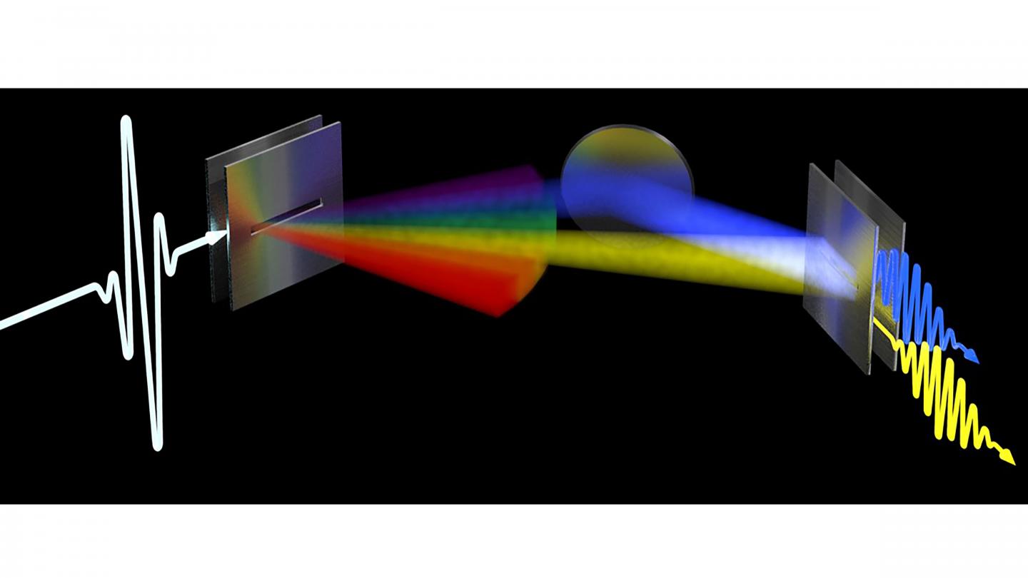 image: Representation of a transmitter (left) broadcasting a signal with strong angular dispersion. Each frequency is represented by a different color and comes out in a different direction, which produces a rainbowlike structure. Two of the frequencies make it to the receiver (right), one represented by yellow (LOS path) and another by blue (NLOS path incorporating a reflection off a surface).