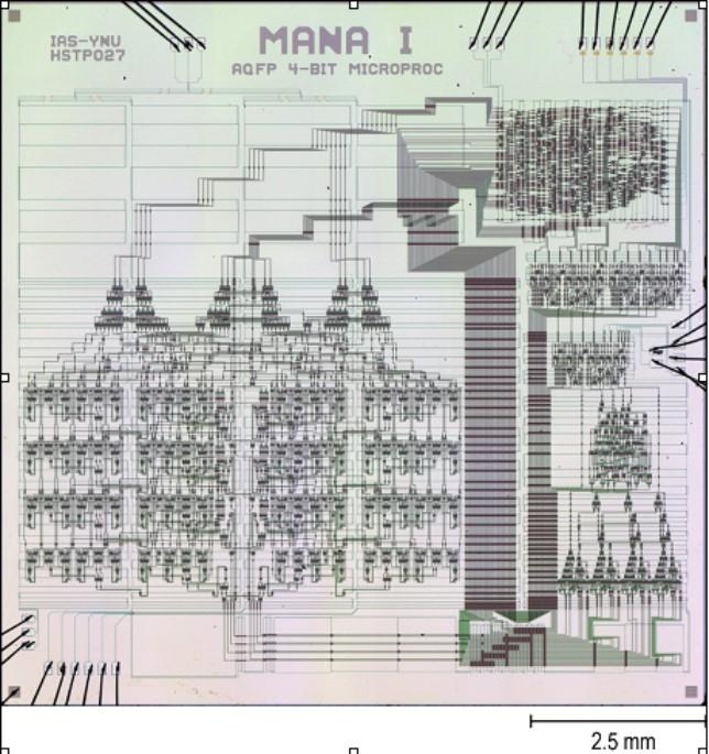 image: AQFP MANA microprocessor die photo. MANA is the world's first adiabatic superconductor microprocessor.