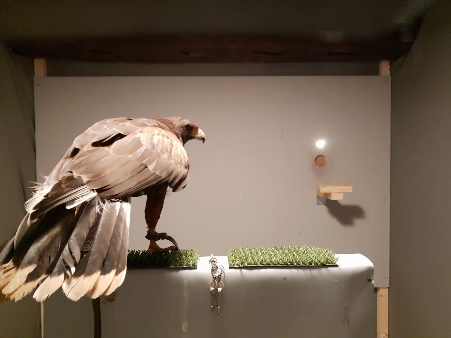 image: The set-up measuring how many blinks per minute a falcon can perceive.