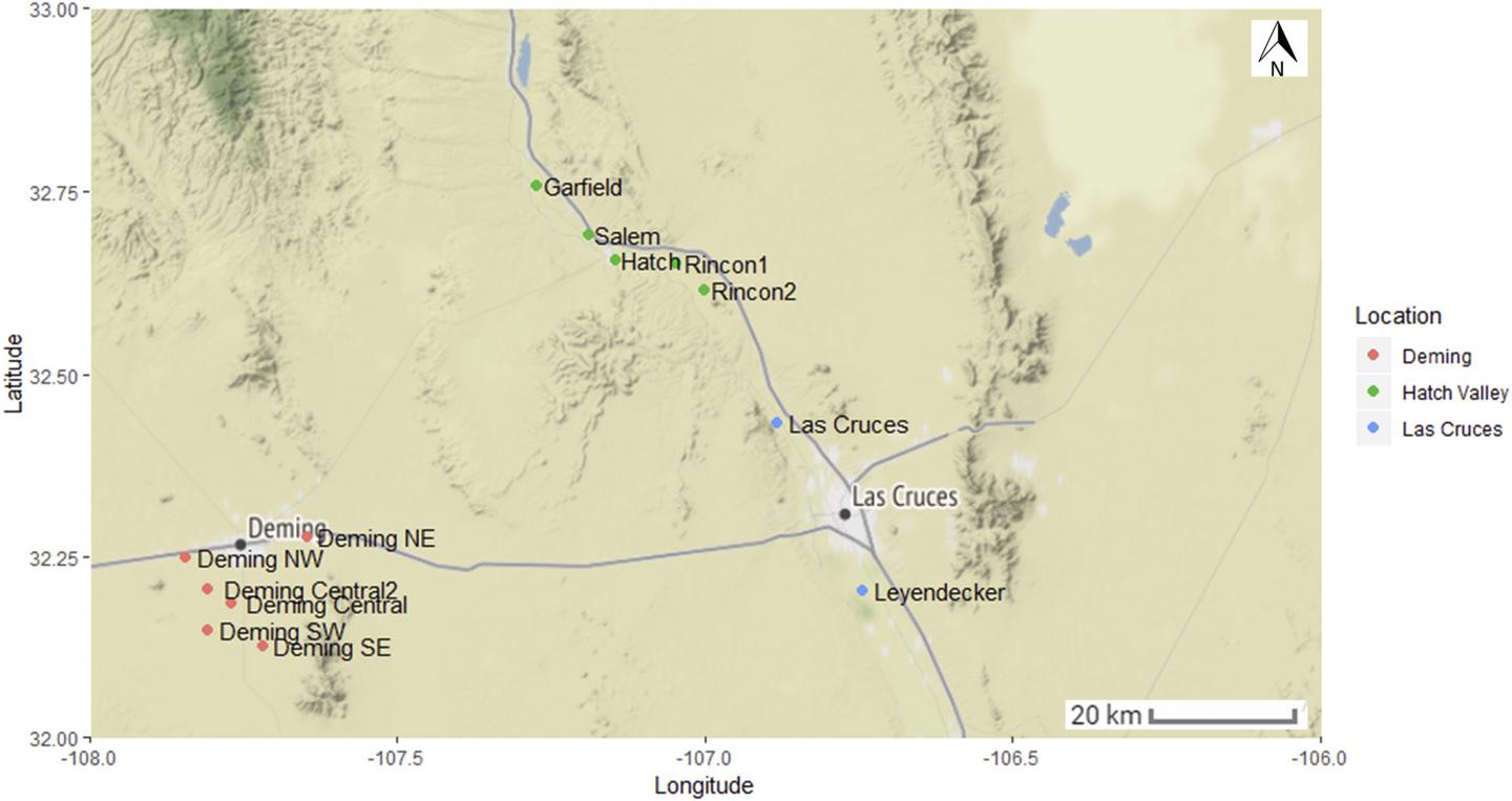 image: Site location of beet leafhopper sampling in southern New Mexico. Each dot represents an individual farm which was sampled, and dots are color coded by area.
