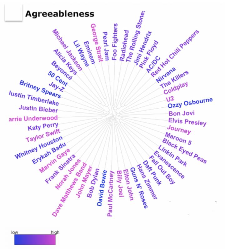 This graph maps the personality trait Agreeableness for fans. The graph shows that fans of Dave Matthews Band, Marvin Gaye, Norah Jones, and U2 are most agreeable while fans of David Bowie, Nirvana, and Ozzie Osbourne are most disagreeable. The blue to pink color spectrum indicates low to high average scores.