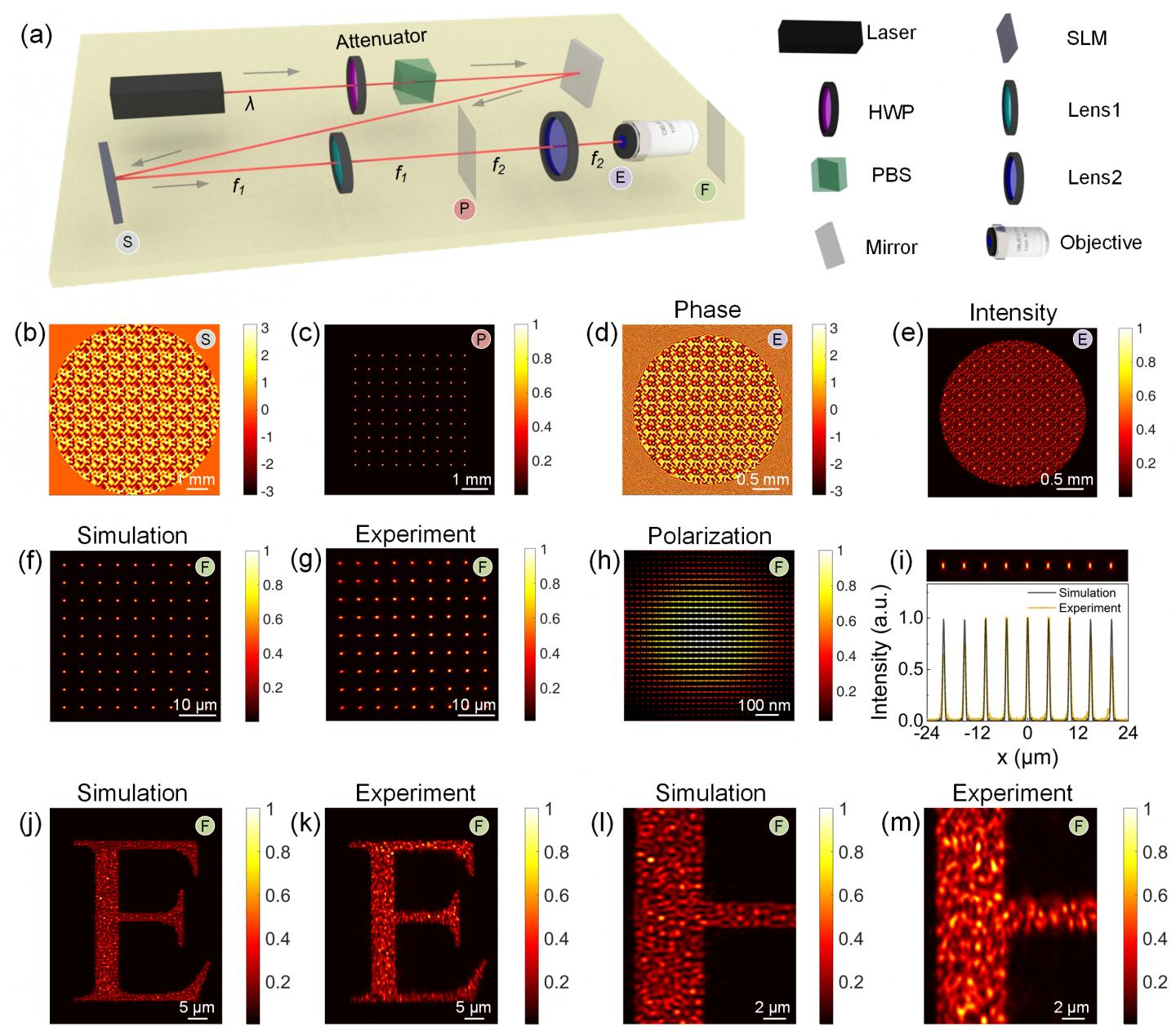 image: (a) Sketch of the optical system. (b) CGH displayed on the SLM for the generation of a 9×9 foci array. (c) The foci array on the focal plane of Lens 1 (P plane). (d) Phase distribution and (e) intensity distribution on the entrance pupil of the objective (E plane). (f) Simulated and (g) measured multi-foci array generated on the focal plane of the objective (F plane). (h) Enlarged intensity profile of a single focal spot in the array. The arrows indicate the polarization directions. (i) Longitudinal intensity profile and corresponding line plot of the foci array. (j) Simulated and (k) measured intensity distribution on the F plane when the CGH for the generation of the pattern "E" is encoded on the SLM. (l-m) Enlarged intensity profiles of the pattern corresponding to (j) and (k) with the same sampling points as in (i).