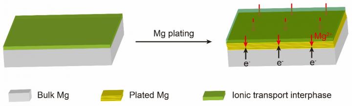 image: Schematic showing the Mg plating behavior in conventional Mg(TFSI)2/DME electrolytes with ionic transport interphase on Mg metal anodes.
