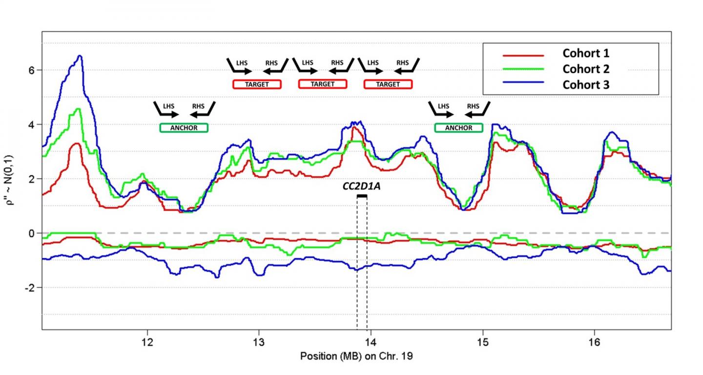 image: Schematic of copy number alteration (CNA) target probe set and anchor probe set placement. Shown (y-axis) are normalized (standard normal distribution) CNA log-rank scores for several cohorts of prostate cancer research samples. Log-rank scores outside 2 standard deviations from the mean (here, above 2 or below -2) indicate statistically significant evidence of a copy number gain or loss, respectively. CNA target probe sets [red rectangles, not to scale, with left-hand side (LHS) and right-hand side (RHS)] are placed throughout the region known to exhibit CNAs (here, around CC2D1A gene). Anchor probe sets (green rectangles, not to scale, with LHS and RHS) are placed in regions previously identified as copy number invariant. The number of sequenced amplification products for CNA target probe sets, normalized by the number of sequenced amplification products for anchor probe sets, serves to estimate copy number (copy number gain in the example shown). MB, megabase.