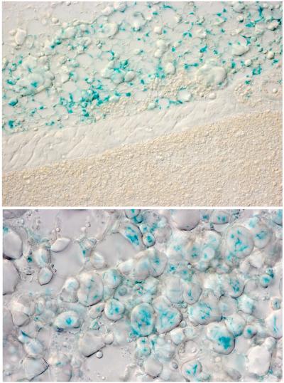 image: These images show expression of the OPN3 gene (in blue) in white fat cells of mice in two locations. The upper panel shows interscapular white adipocytes (above a layer of muscle and above brown adipose tissue). The lower panel shows white adipocytes from the inguinal adipose depot.