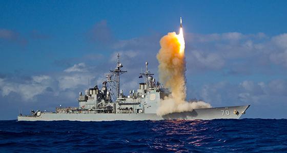 image: Launch of SM-3 Block IB interceptor from guided-missile cruiser USS Lake Erie (CG 70).