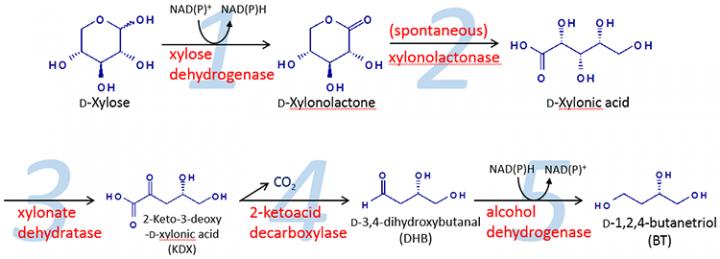 However in steps 1, 3 and 4 of the reaction, there were no enzymes to provide a catalyst in the yeast. In this study, rice straw hydrolysate was used to produce xylose. The yeast used was genetically engineered with the required enzymes in order to successfully produce an efficient yield of 1,2,4-butanetriol.