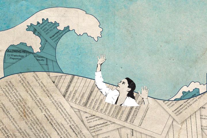 image: A female physicians is swallowed by a wave of paperwork in this depiction of burnout.