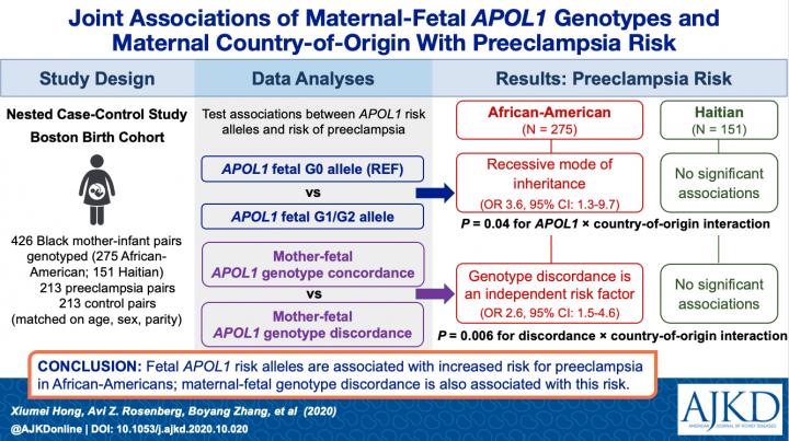 Preeclampsia, characterized by increased blood pressure after 20 weeks of pregnancy, as well as other abnormalities (e.g., protein in the urine), is dangerous to mothers and their infants. Previous studies found that individuals with African ancestry may carry APOL1 genetic variants that increase risk for chronic kidney disease. This study published in the American Journal of Kidney Diseases (AJKD) found that fetal high-risk APOL1 genotypes and maternal-fetal APOL1 genotype discordance independently contribute to preeclampsia risk in African-American mothers. This association was not observed in Haitian mother-infant pairs possibly because of different environmental exposures and cultural milieu. Additional studies are required to understand why APOL1 associations with preeclampsia differ by maternal country of origin and to improve management of mothers at risk for preeclampsia.