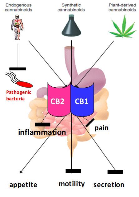 image: The mammalian cannabinoid receptors (CB1 and CB2) sense endogenous endocannabinoids and plant and synthetic cannabinoids to engender a response in the host that leads to decreased inflammation, intestinal motility and secretion, and increased appetite. Mammalian endocannabinoids are also sensed by a bacterial cannabinoid receptor to decrease virulence of enteric pathogens.