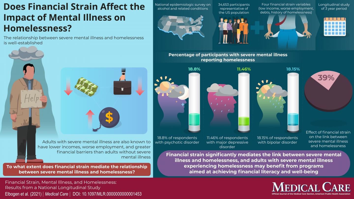 The finding that financial strain accounts for part of the impact of severe mental illness "suggests that addressing mental illness without consideration of financial strain may not lead to optimal reduction in homelessness risk," Dr. Elbogen and colleagues add. The study supports efforts to help homeless individuals grow financially through employment, increased financial knowledge, and money management skills - as offered in effective interventions such as Housing First and VA homeless programs.