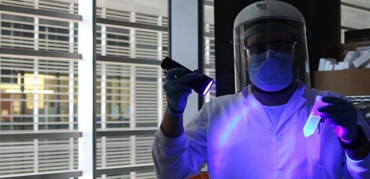 They constructed a chemical complex that binds to polyhistidine tags and can be stimulated by ultraviolet (UV) radiation to fluoresce with visible light. The regions of the gel carrying tagged proteins can be readily detected by the light given off by the UV-excited "fluorophore" complexes bound to the tags.
