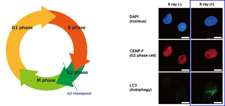 image: (Left) Cell cycle indicating the G2 checkpoint right before the M phase, which denotes cell division. (Right) MIA PaCa-2 cells were autophagy-positive (LC3-positive) 12 hours after X-ray irradiation. In contrast, no autophagy was found in non-irradiated cells.