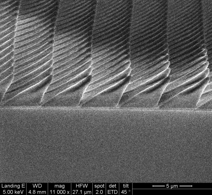 Fireflies' lanterns also have these microstructures, but the researchers noticed that the microstructures on firefly lanterns were asymmetric -- the sides slanted at different angles, giving a lopsided appearance.