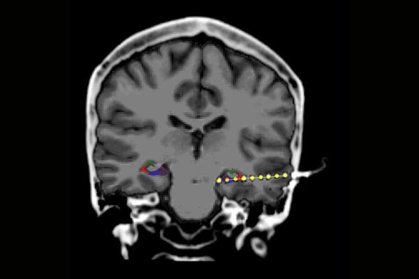 image: Electrode (yellow dots) implanted in the hippocampus of a patient undergoing epilepsy monitoring, viewed with MRI. Colors indicate sub regions of the hippocampus. Sharp wave ripples appear most prominently in the CA1 region, shown in red.