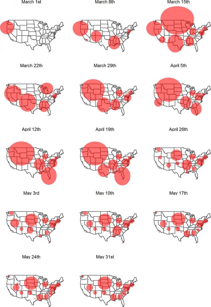 Using innovative space-time statistics, the researchers detected geographic areas where the population had an elevated risk of contracting the virus. They ran the analysis every day using daily COVID-19 case counts from Jan. 22 to June 5, 2020 to establish regional clusters, defined as a collection of disease cases closely grouped in time and space. For the first month, the clusters were very large, especially in the Midwest. Starting on April 25, the clusters become smaller and more numerous, a trend that persists until the end of the study.