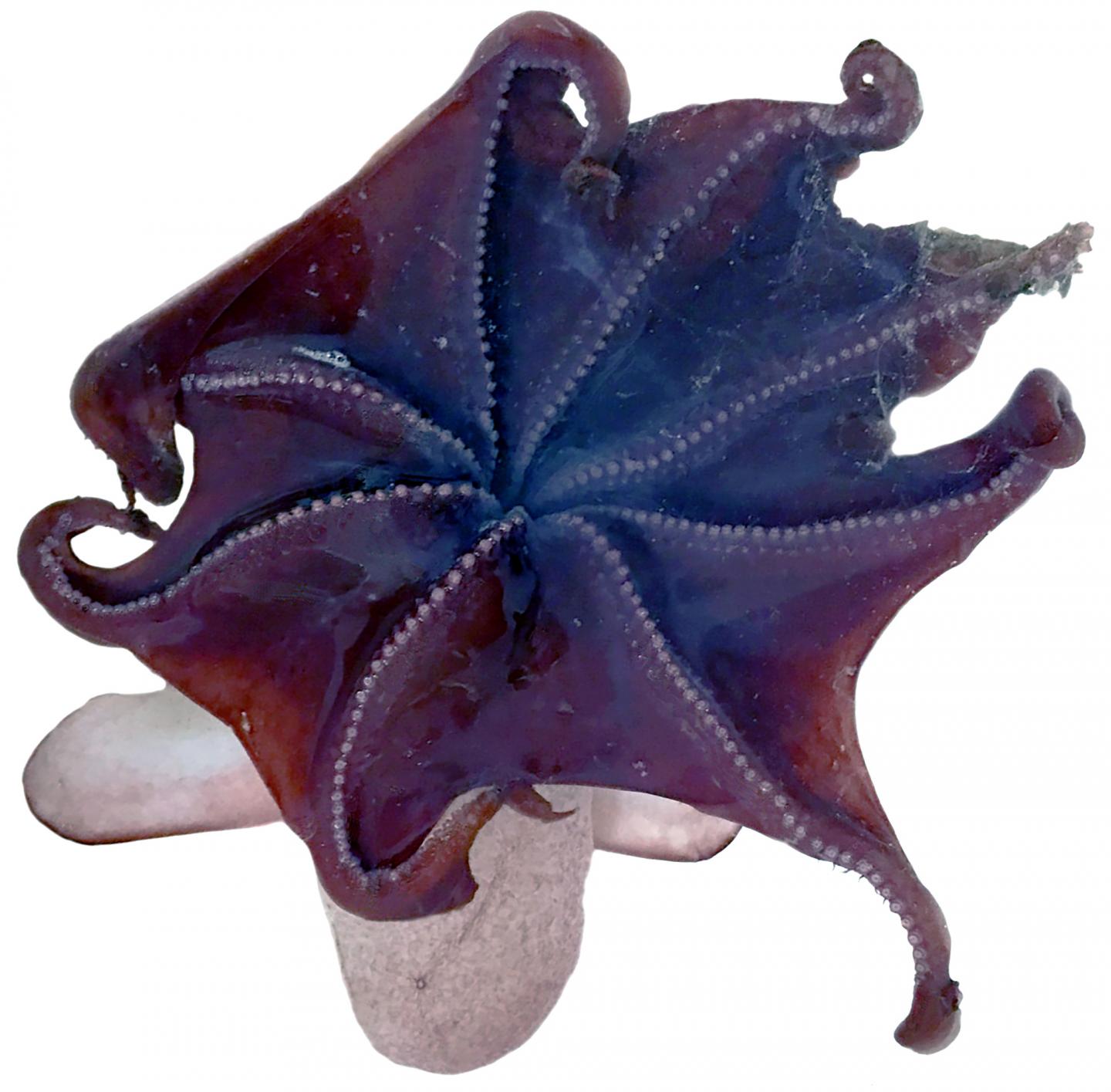 The web that stretches between the arms, with which the dumbo slowly floats down in the water column, catching worms and crustaceans as if in a bell, also only reaches just over halfway from the mouth down the arms. "The web is much longer in dumbo octopus species that mainly float freely in the water column," Ziegler says. This would indicate that the new species lives close to the seafloor, because otherwise the web would be a hindrance to movements on the bottom.