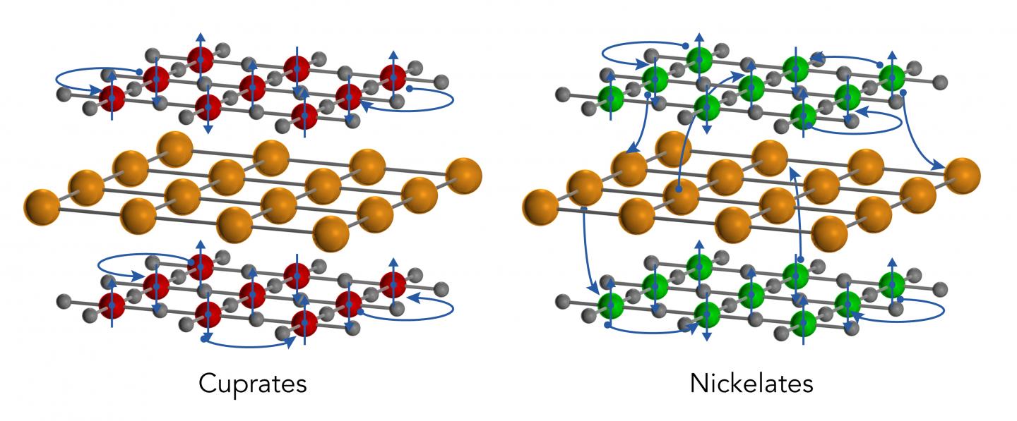 Both cuprates and nickelates come in thin, two-dimensional sheets that are layered with other elements, such as rare-earth ions. These thin sheets become superconducting when they're cooled below a certain temperature and the density of their free-flowing electrons is adjusted in a process known as "doping."