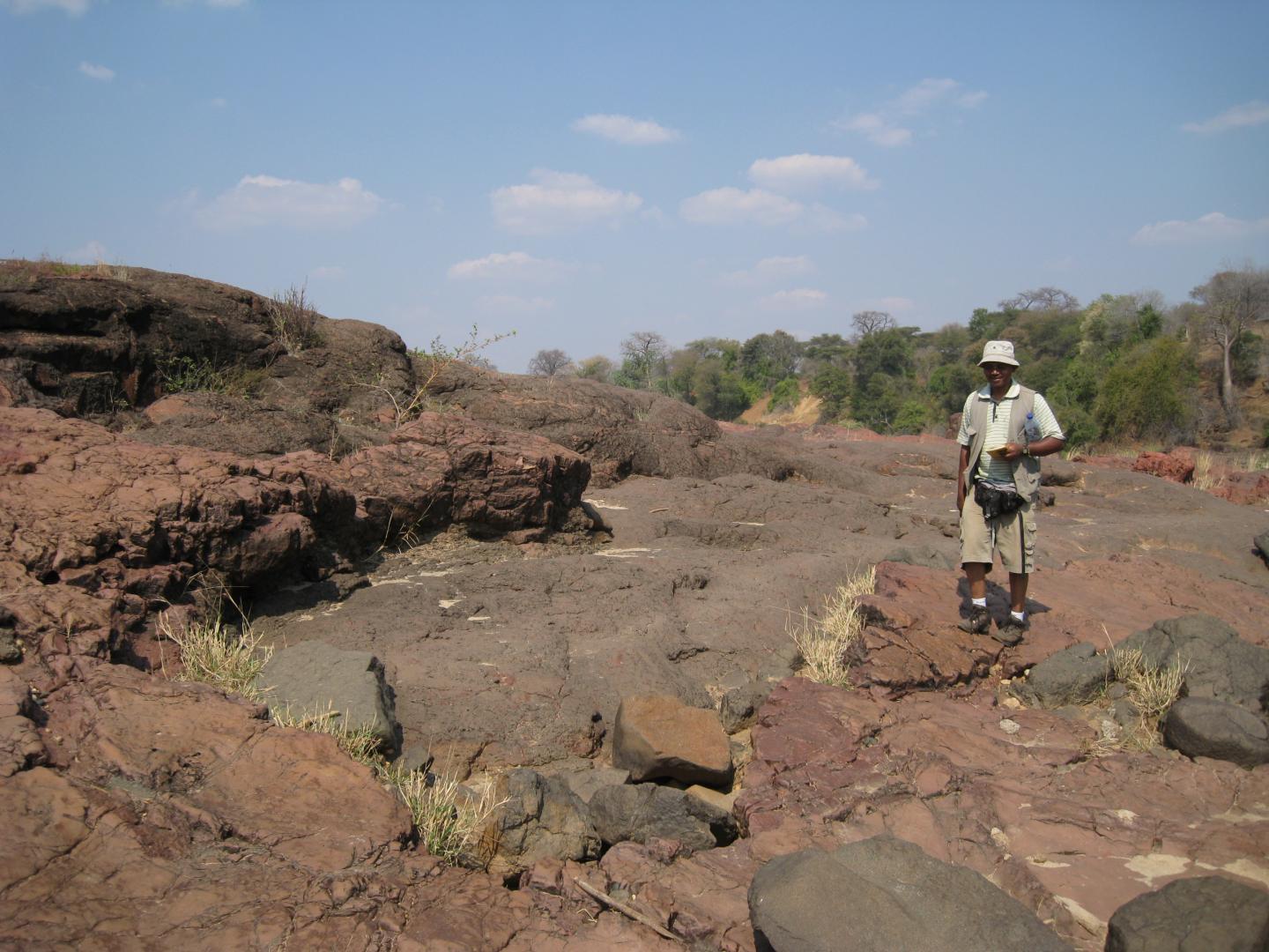 image: Professor Daúd Jamal standing next to picrite lava outcrops on the Luenha River, Central Mozambique.