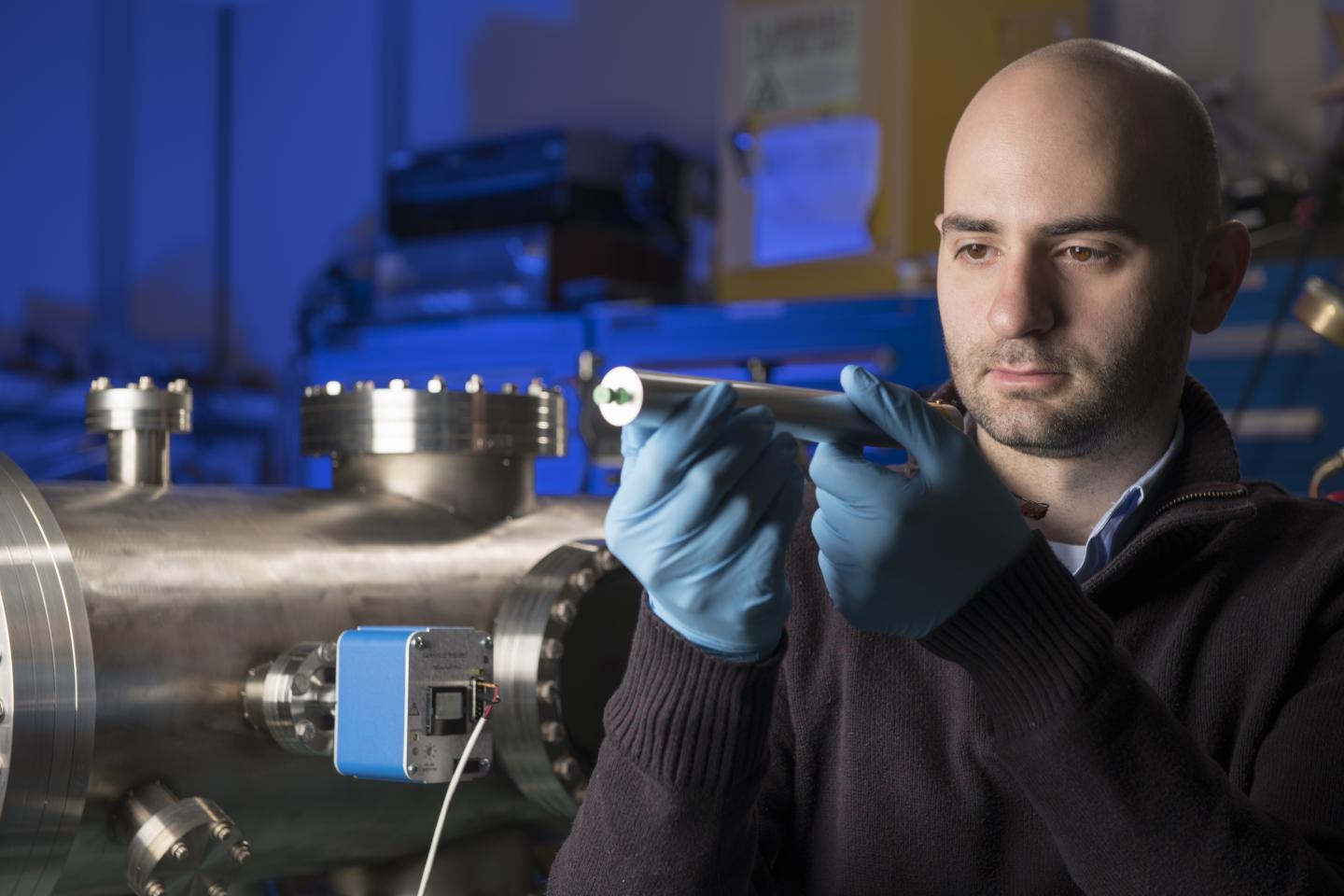image: David Flay examines the Muon g-2 plunging probe installation.