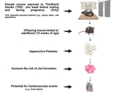 Health problems associated with smoking and being near someone who is smoking (secondhand smoke) are well established. A new study from Texas A&M University suggests the residual smoke that remains even after a cigarette is put out -- called thirdhand smoke -- could affect the health of fetuses. The researchers exposed pregnant mice to smoke contaminants from extinguished cigarettes and traced health markers in their offspring. They found that mice exposed to thirdhand smoke in utero showed a significant increase in aggregation of platelets, a component of blood involved in clotting. In other tests, these mice showed markers indicating a predisposition toward cardiovascular problems related to blood clots. Researchers say the study draws attention to the need to further investigate the potential consequences of thirdhand smoke exposure.