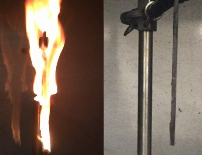 image: A flammable epoxy resin (left) burns, but one coated with a plant-derived flame retardant (right) does not.