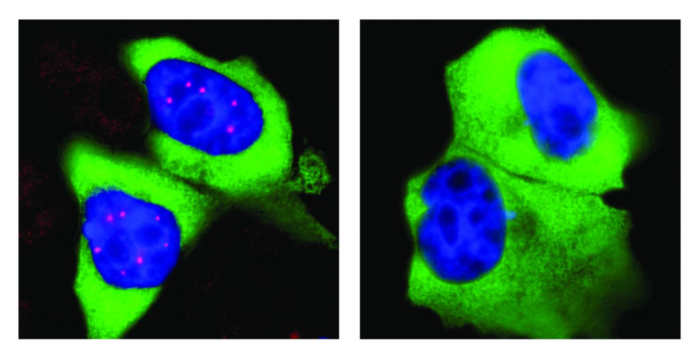 image: SMN is concentrated in the Cajal bodies (left, red) in the nucleus of human cells (blue). If phosphorylation of SMN is inhibited, the concentration ceases and Cajal bodies disappear.