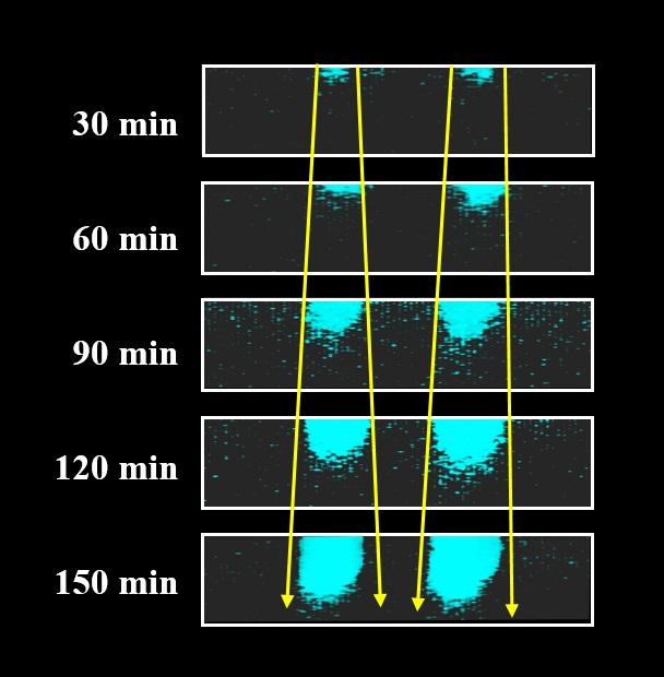 image: Heating a thin sheet of polypropylene for 30-150 minutes causes aging, which scientists can see as blue fluorescence in this magnified cross-section.