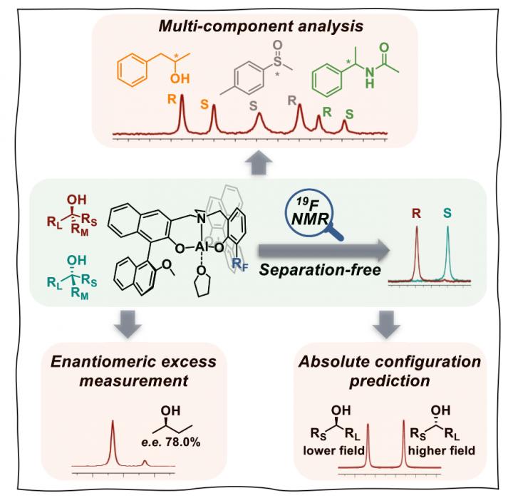In this study, the researchers developed a series of 19F-labeled chiral aluminum complexes that reversibly bind to various Lewis basic analytes.