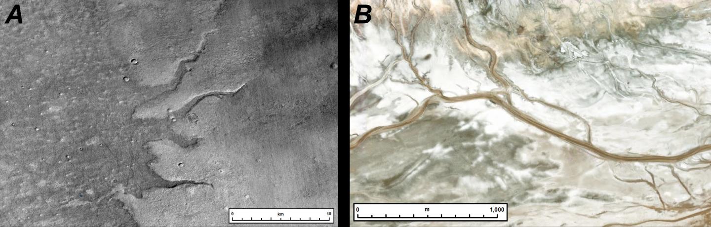image: (A) A suite of ridges on Mars (at -67.64°E, 43.37°S). To determine whether features are ridges or valleys, the researchers rely on lighting in the impact craters (depressions). Based on the craters, the light is coming from the top of the image. Because the fluvial ridges are casting shadows to the south, they can infer that the feature is sticking up from the surface--a ridge rather than a valley. (B) A similar, "analogue" environment on Earth. Fluvial ridges similar to the ones on Mars are in California's Amargosa river system, although with water still running through the system, it's the active precursor to the ridges that are remnant on Mars.