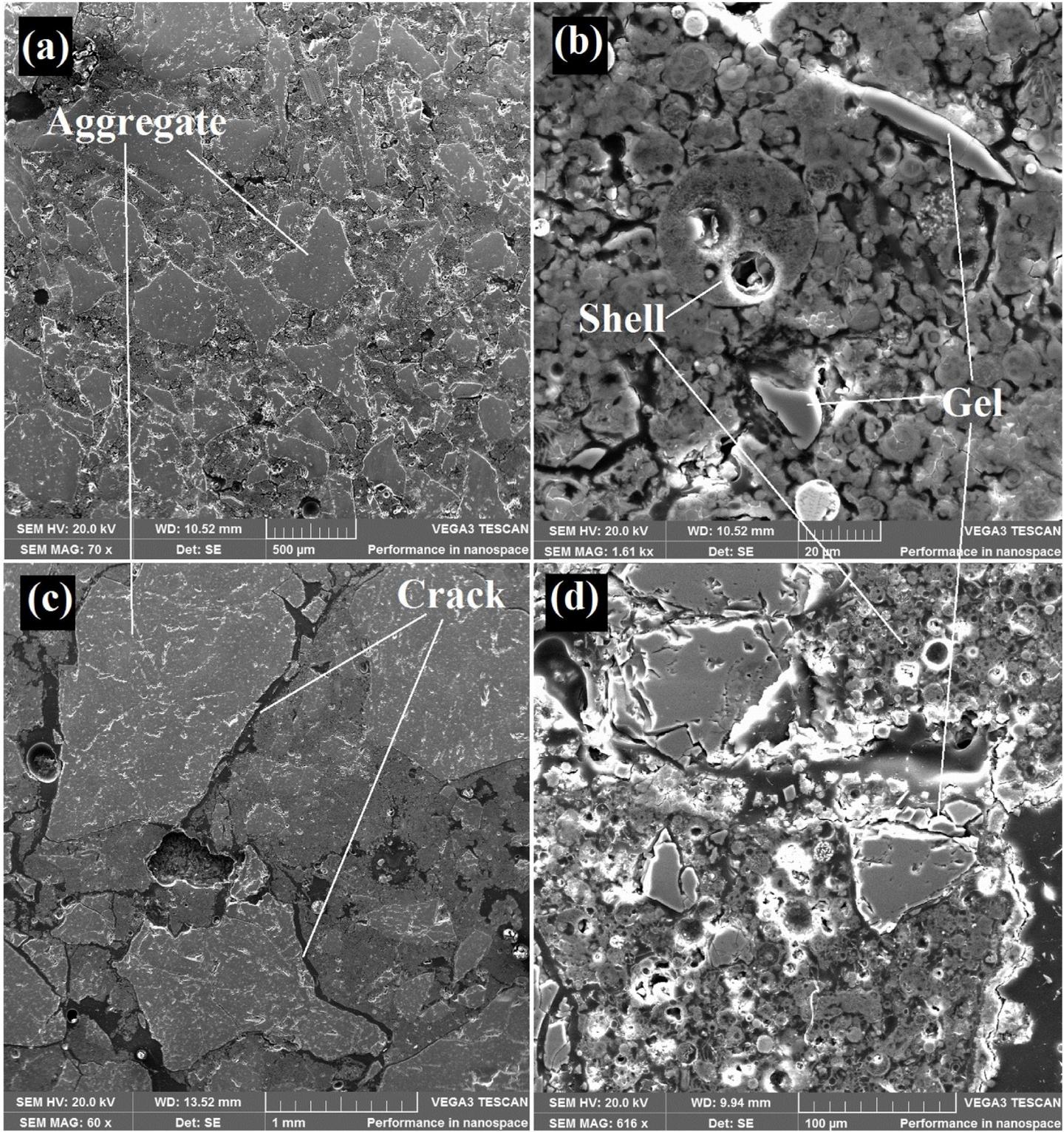 image: Geopolymer concrete blocks, heat cured at 200 degrees Celsius and then immersed in an extreme alkali medium for 14 days at 80 degrees Celsius (a and b), resist the attack significantly better than blocks heat-cured at 600 degrees Celsius and subjected to the same treatment (c and d) in this series of scanning electron microscope images. The blocks show the presence of a gel-like substance, characteristic of alkali attack from the 3M NaOH solution. The heat-curing significantly reduced in the intensity of the attack but could not prevent it.