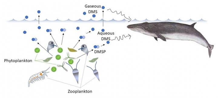 Their work revealed that, as hypothesized, zooplankton grazing on phytoplankton seems to result in higher localized concentrations of DMS compared to surrounding areas. In contrast, no association was found between fish biomass and DMS concentration. Simulations based on their measurements show that if large marine predators, such as whales, are able to detect the DMS concentration gradient, following increasing concentrations of DMS would allow them to reach denser zooplankton feeding areas than if they swam randomly.
