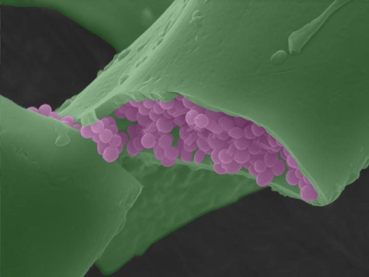 image: False-colour scanning electron microscope image of melanosomes within a barb of a modern bird feather