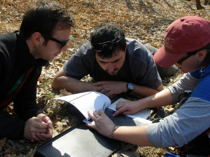 image: Research team members Marius Robu, Alexandru Petculescu and Claire Terhune discuss where to look for fossils in the Olte? River Valley.