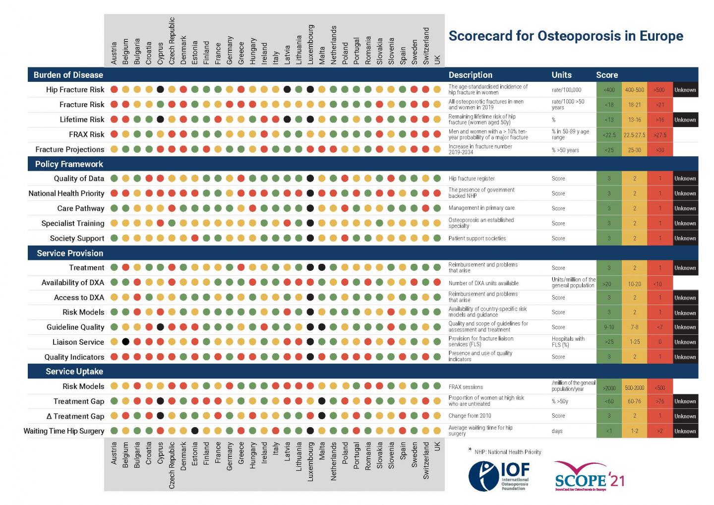 June 7, 2021 - Nyon, Switzerland -- A new report by the International Osteoporosis Foundation (IOF) draws attention to the burden of osteoporosis and the gaps and inequalities in the provision of primary and secondary prevention of fractures due to osteoporosis across Europe. 'SCOPE 2021: a new scorecard for osteoporosis in Europe' provides detailed findings for the 27 countries of the European Union as well as Switzerland and the United Kingdom (referred to as 'EU27+2'), covering key indicators for four domains: burden of disease, policy framework, service provision and service uptake.