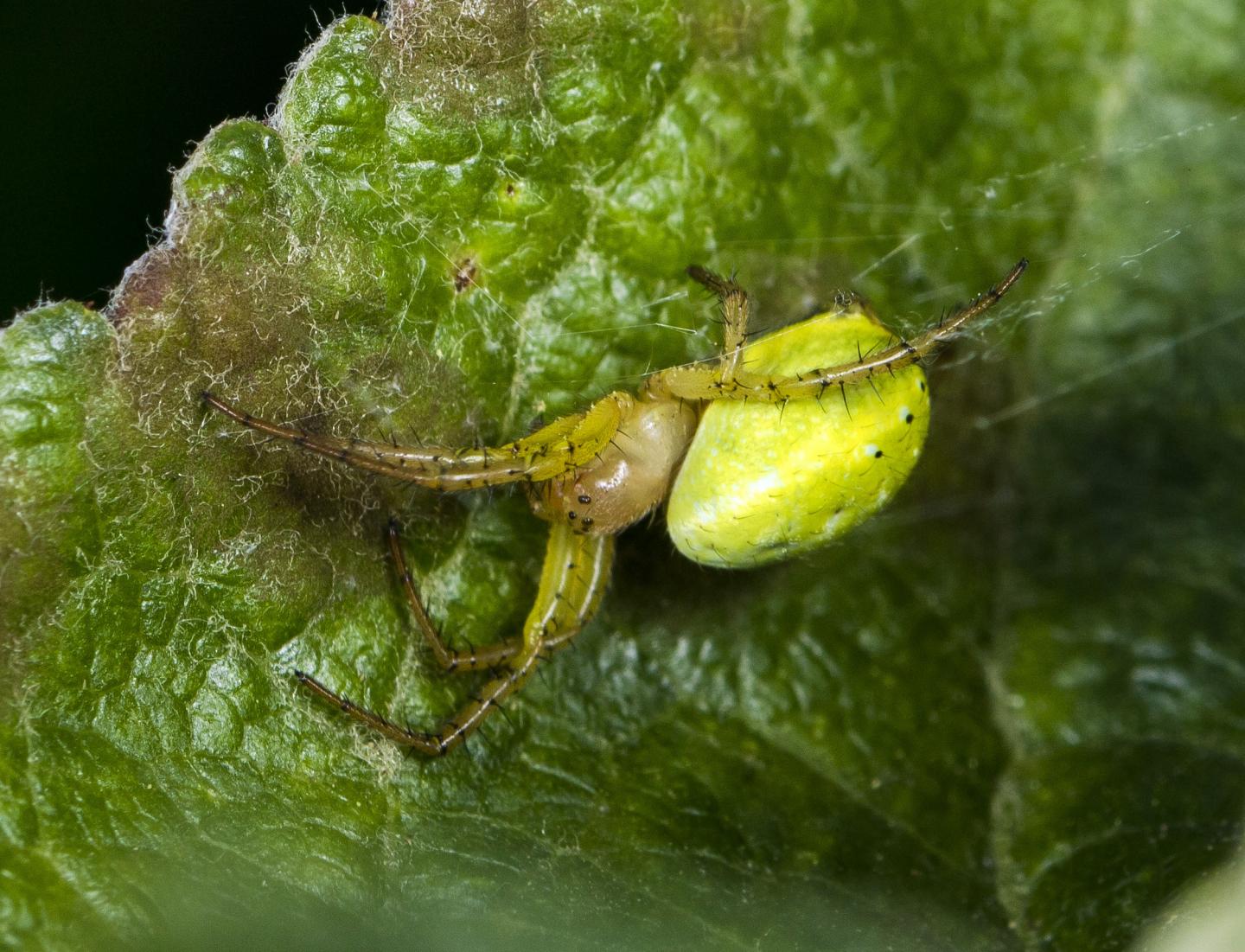 Curiously, spiders in the genus Araniella are green in colour due to certain bile pigments (biliverdin) that make them very difficult to spot in their natural habitat, as they live mostly on leaves.