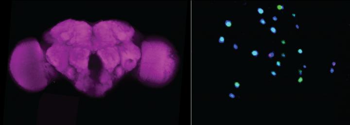 image: (Left) Whole brain of a fruit fly. (Right) Nuclei of neurons in fruit fly brain tissue.