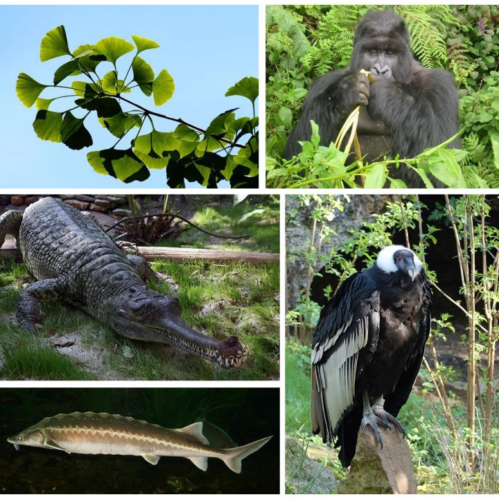 image: The ginkgo, the western gorilla, the gharial, the European sturgeon, and the Andean condor are classified as species in danger of extinction by IUCN. These species exhibit peculiar functional traits such as large size, long lifespan, and late sexual maturity (All photos CC-BY-SA)