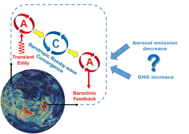 They found that the relative strength of haze events in the North China Plain region have increased under the RCP8.5 scenario, induced by a stronger and longer-lasting anticyclone anomaly in eastern China. The strengthened anticyclone anomaly is mainly induced by increased northern wave train convergence and the longer duration of the anticyclone anomaly is mainly induced by stronger local feedback from the basic state. It was found that the climate effects induced by aerosol reduction plays a leading role in the anticyclone change in eastern China, while the effects from increased greenhouse gases are small.
