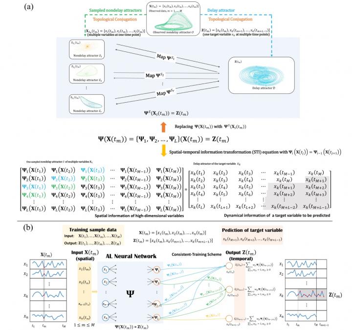 To address this issue, Prof. CHEN Luonan (Institute of Biochemistry and Cell Biology, Chinese Academy of Sciences) with Dr. CHEN Chuan(Sun Yat-sen University), Prof. MA Huanfei (Soochow University) and Prof. AIHARA Kazuyuki (University of Tokyo) proposed a new dynamics-based data-driven method, Anticipated Learning Machine (ALM), for achieving precise future-state predictions based on short-term but high-dimensional data. Actually, the ALM is a multi-layered neural network, where high-dimensional variables are taken as input neurons (multiple variables but at a single time point) but a target variable is taken as output neurons (single variable but at multiple time points). In this way, ALM is able to transform the recent correlation/spatial information of high-dimensional variables to future dynamical/temporal information of any target variable, i.e. by spatial-temporal information transformation (STI) equations.