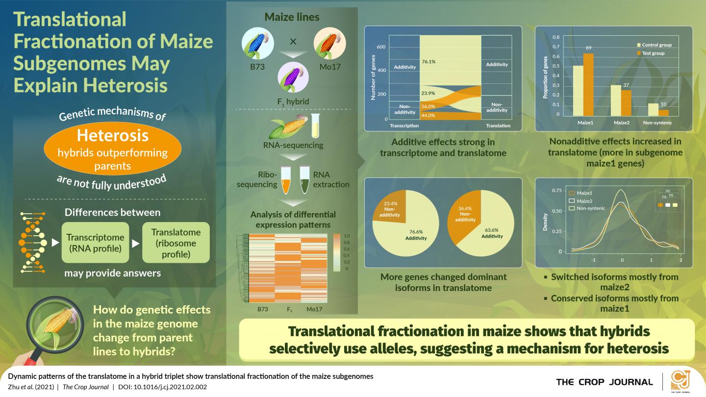 Using the new ribosome profiling technique, the researchers, led by Professor Lin Li of National Key Laboratory of Crop Genetic Improvement, Huazhong Agricultural University, evaluated the maize parental lines B73 and Mo17, and their F1 offspring. Their findings, published in The Crop Journal, suggest the presence of prominent subgenome bias at the translation level, especially skewed towards translated subgenome maize1 genes, which had a nonadditive effect on heterosis in F1 plants.