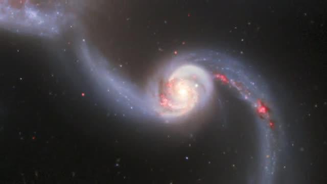 The two galaxies, astronomers have concluded, have already "collided" at least once. However, galactic collisions can be a lengthy process of successive gravitational encounters, which over time can morph the galaxies into exotic, yet unrecognizable forms. These galaxies, as in all galactic collisions, are engaged in a ghostly dance as the distances between the stars in each galaxy preclude actual stellar collisions and their overall shapes are deformed only by each galaxy's gravity.