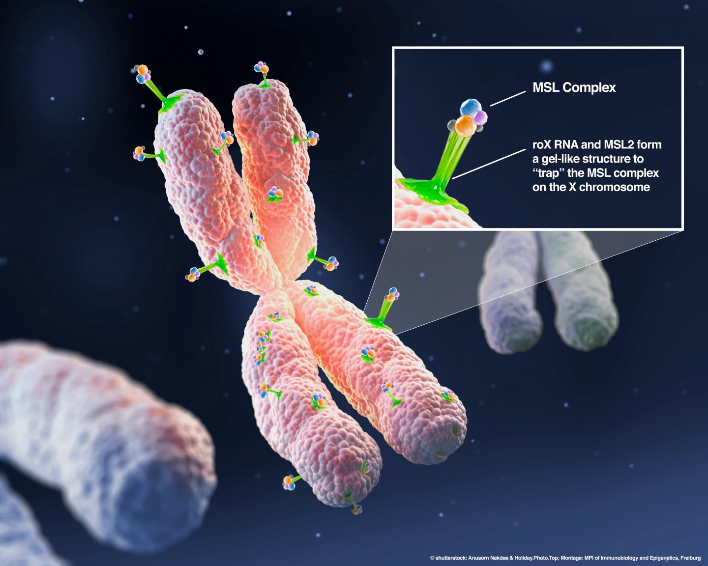 image: MSL2 and the roX2 RNA, exclusively synthesized from the male X chromosome, form a gel-like glue (green gel) that attaches the MSL complex specifically to the X chromosome in flies.