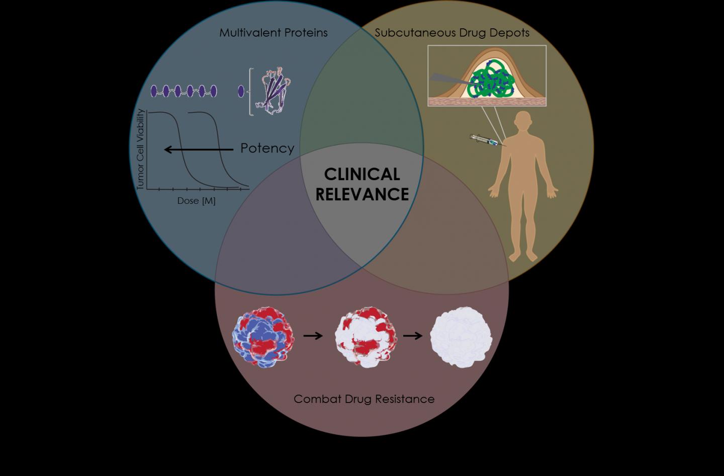Using a combination of CRISPR-based targeting, a protein "depot" that allows for sustained release of the drug and a highly potent binding system, the team showed that their new strategy could overcome three critical problems that limit the efficacy of many cancer drugs-- their limited potency, their quick elimination from the body, and the ability of cancer cells to develop resistance to the drug.