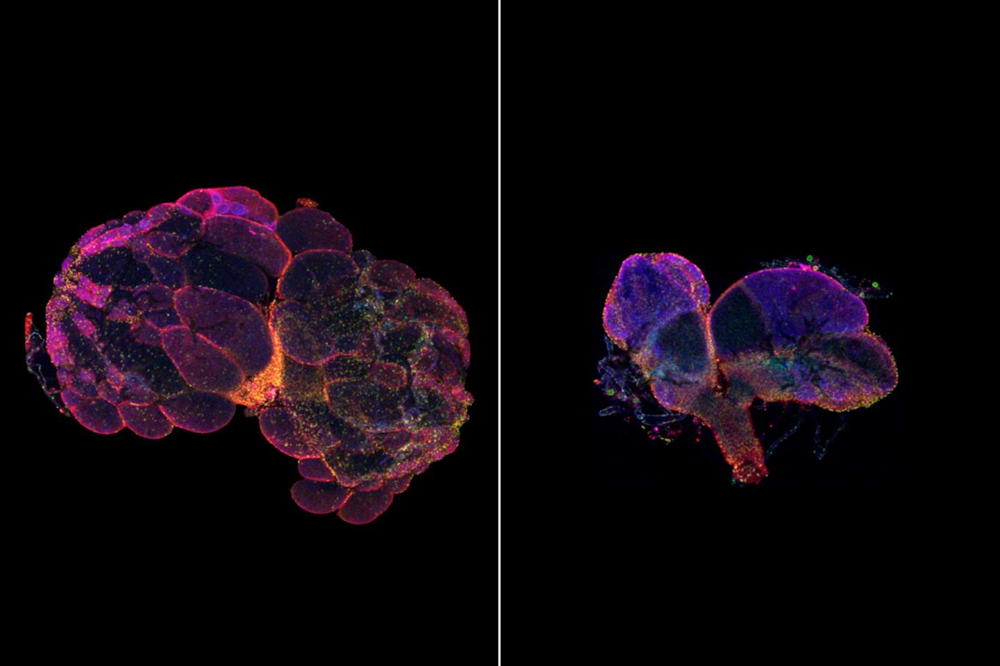 image: Researchers at Washington University School of Medicine in St. Louis have identified a gene that plays an important role in fertility across multiple species. Pictured is a normal fruit fly ovary (left) and a fruit fly ovary with this gene dialed down (right). Male and female animals missing this gene had substantially defective reproductive organs. The study could have implications for understanding human infertility and early menopause.