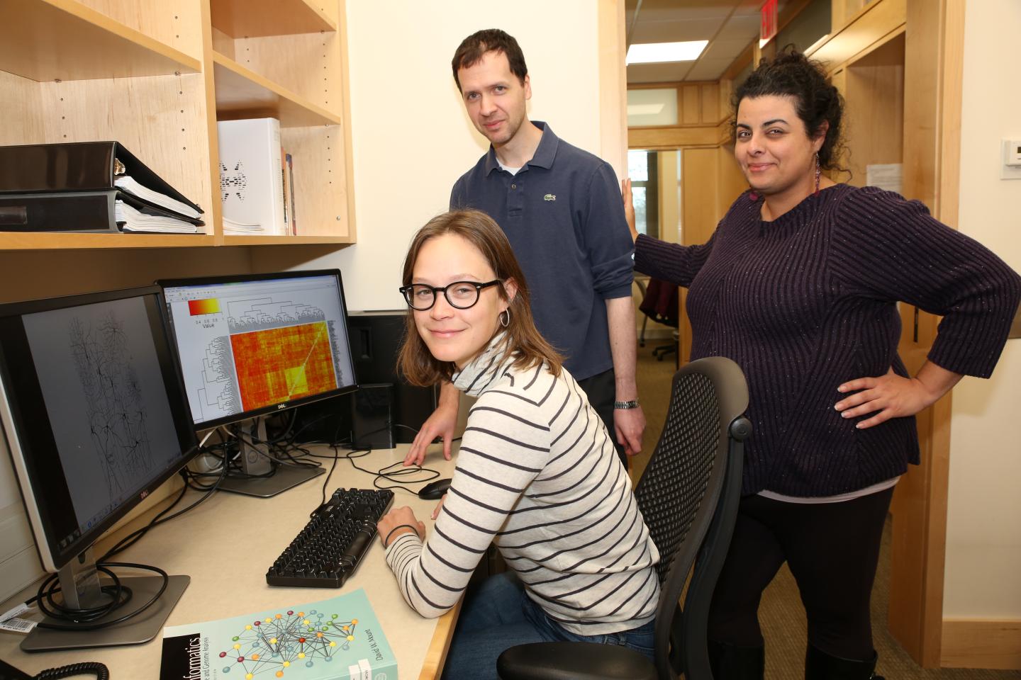 image: Lead author Megan Crow (left), Associate Professor Jesse Gillis, and postdoctoral researcher Sara Ballouz (right) worked together with researchers from the University of British Columbia to analyze the differential expressions of disease samples from over 600 data sets.