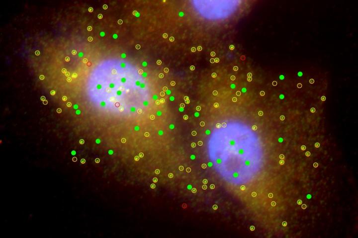 image: When viewed under a fluorescence microscope, the individual probes light up each RNA in an individual cell. By using a color combination method, UD molecular biologist Mona Batish is able to distinguish which tagged RNA are linear (yellow) and circular (green).