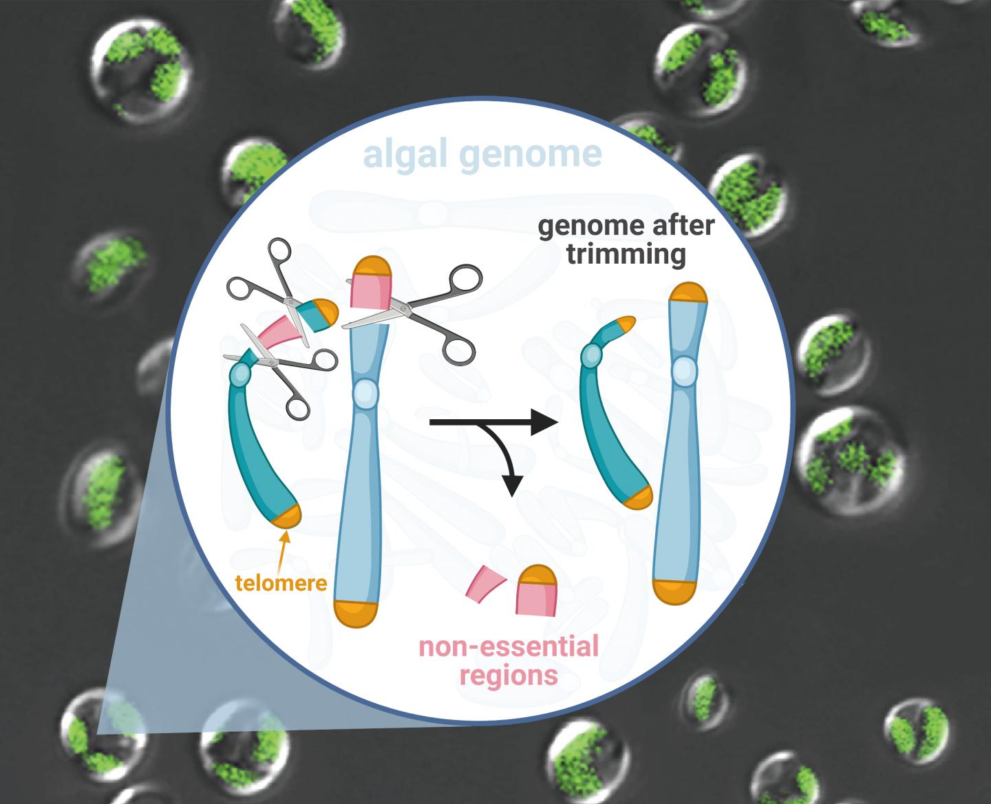 A single-celled alga undergoes genome surgery to remove non-essential parts. This can lead to a most efficient cellular factory for producing sustainable biofuels from sunlight and carbon dioxide.