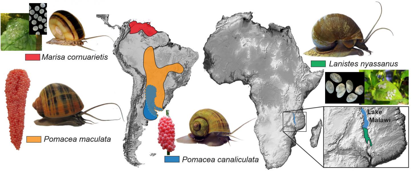 image: A figure showing the native range of the four apple snail species included in the study, and pictures of their adult and egg forms. The reddish-pink calcareous eggs of the two Pomacea species are deposited on land, whereas the white gelatinous eggs of Lanistes nyassanus and Marisa cornuarietis are deposited underwater.